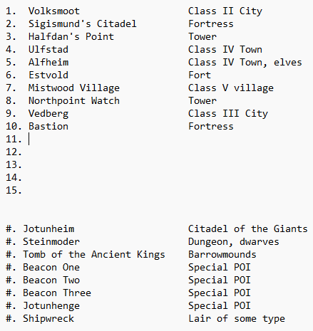So with the text providing some more history about the region and a regional map complete, I believe the next step is going to be setting up some points of interest. By the book for a regional map of this size I’d be looking at 45 static points of interest with a third representing settlements & fortifications, and the remainder being dungeons / lairs / special PoIs.